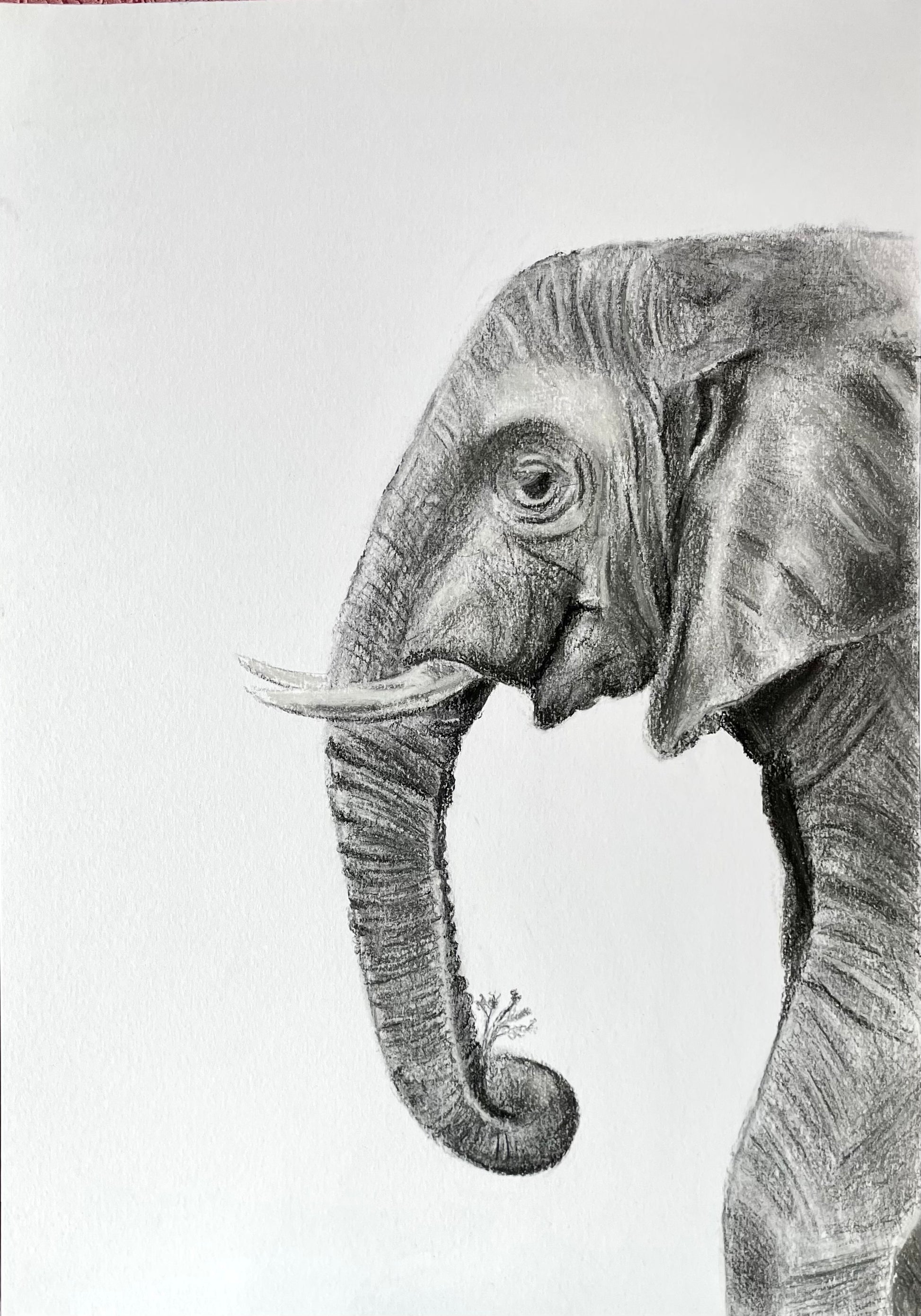 1 of 3 wildlife portraits. The elephant was chosen as the subject of this charcoal study because these gentle giants are an expression of strength and resilience in the face of trials and loss.